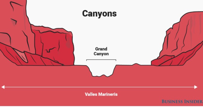 Valles Marineris est un vaste système de canyons situé à proximité de l’équateur de la planète Mars. Côté mensurations, il est presque cinq fois plus profond, environ quatre fois plus long et vingt fois plus large que le Grand Canyon sur Terre.