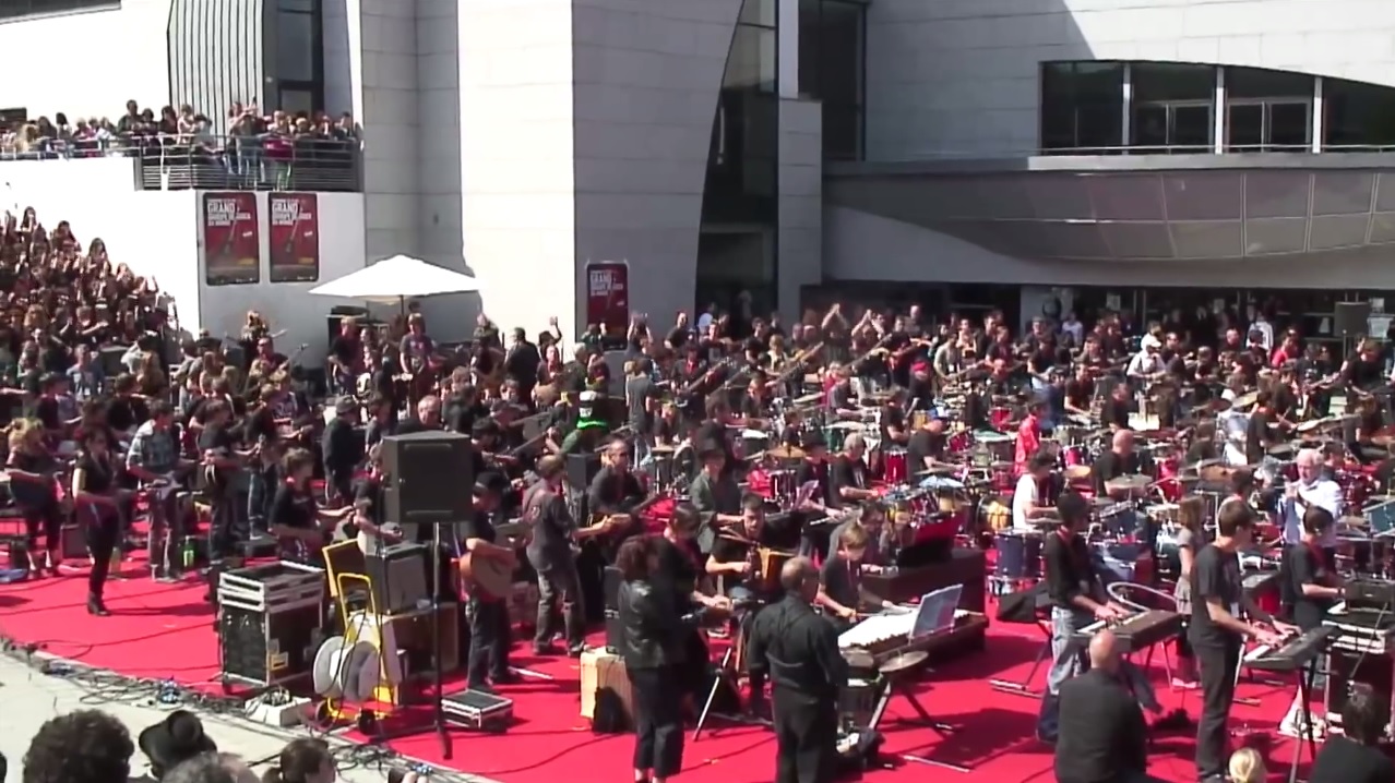 Plus de 1000 musiciens sur la pelouse du Stade du Moustoir à Lorient pour réaliser une performance incroyable et devenir ainsi, le plus grand groupe de rock du monde. Le défi est relevé par l’association MAPL (Musiques d’aujourd’hui au pays de Lorient).