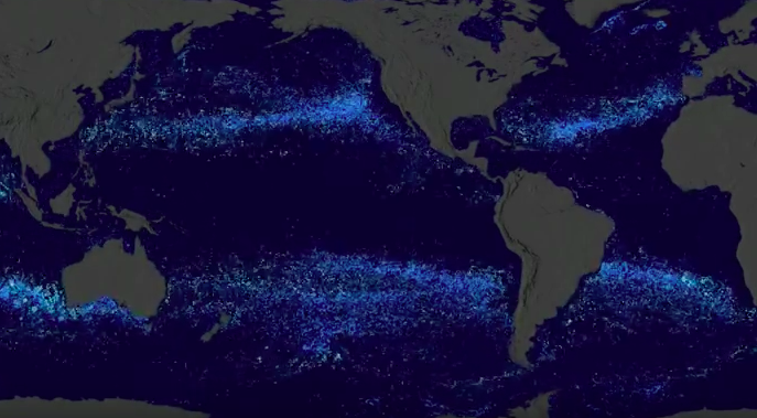 « Nous commençons avec les données de bouées scientifiques flottantes que la NOAA (National Oceanic and Atmospheric Administration, ndlr) a lâchées dans les océans durant les 35 dernières années, représentées ici sous forme de points blancs. Accélérons le temps pour voir où vont les bouées… Nous pouvons observer leurs schémas de migration. Le nombre de bouées diminue parce que certaines ne durent pas aussi longtemps que les autres. Les bouées migrent vers 5 gyres océaniques connus, également appelés vortex de déchets » explique la Nasa dans la vidéo.
