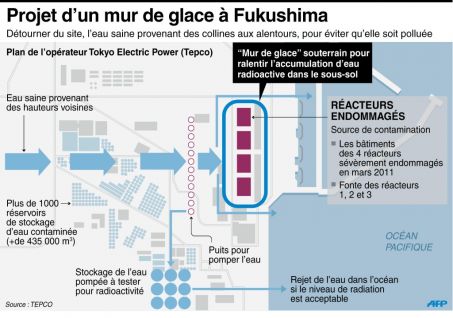 L’opérateur de la centrale accidentée de Fukushima s’attaquait le mardi 22 août au dernier tronçon d’un mur de glace souterrain de 1,5 km de long. Le but : empêcher que les eaux souterraines de la montagne contaminées par la centrale ne se déversent dans le Pacifique. L’opération consiste à couler un réfrigérant dans des tuyaux placés à la verticale autour de quatre des six réacteurs du site. Le sol gèle alors sur une épaisseur d’environ trois mètres et une hauteur de 27 mètres sur la totalité du périmètre. Une fois le nouveau tronçon terminé, il faudra néanmoins plusieurs semaines avant que la terre située autour ne soit prise dans la glace.