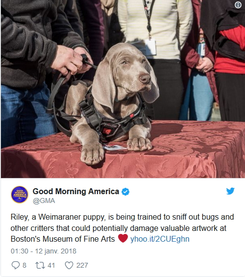 Le nouvel employé du musée est un braque nommé Riley et a déjà été présenté à la presse. L’animal sera dressé à renifler et débusquer les différents parasites qui sont susceptibles de pénétrer dans les galeries. Alors que les insectes sont un problème récurrent pour ce genre d’établissements, le Musée des Beaux-Arts de Boston utilise déjà différentes méthodes comme la mise en quarantaine des œuvres avant leur exposition, mais les visiteurs restent susceptibles d’amener des parasites avec eux lors des visites.