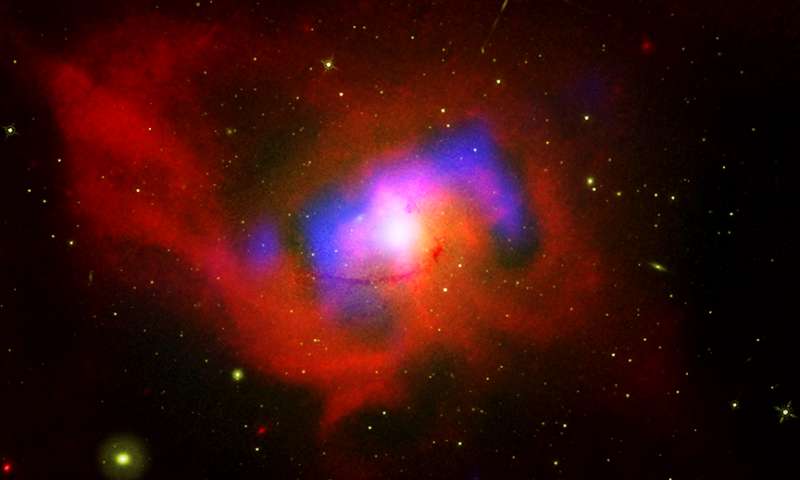 Des salves répétées de particules énergétiques dans les jets pulsés par le trou noir ont en effet été décelées au centre de NGC 4696. Les chercheurs menés par Jeremy Sanders, de l’Institut Max Planck en Allemagne, rapportent que ces salves créent de vastes cavités de gaz chauffés à plusieurs millions de degrés qui percent l’espace entre les galaxies à des vitesses proches de celle de la lumière. Ces éclats créent également des ondes de choc semblables à des « bangs » supersoniques produits sur Terre par les avions à de très grandes vitesses. Au total, les chercheurs ont identifié neuf cavités couvrant près de 122 000 années-lumière de distance.