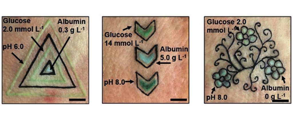 « La modification corporelle par injection de pigments dans le derme (tatouage) est une coutume vieille de plus de 4 000 ans, explique la chercheuse. Ici, une technologie cosmétique fonctionnelle a été développée en combinant des biocapteurs artistiques et des biocapteurs colorimétriques… Les capteurs de tatouage cutané ont fonctionné comme des écrans de diagnostic en présentant des changements de couleur dans le spectre visible en réponse à des variations de concentrations de pH, de glucose et d’albumine ».