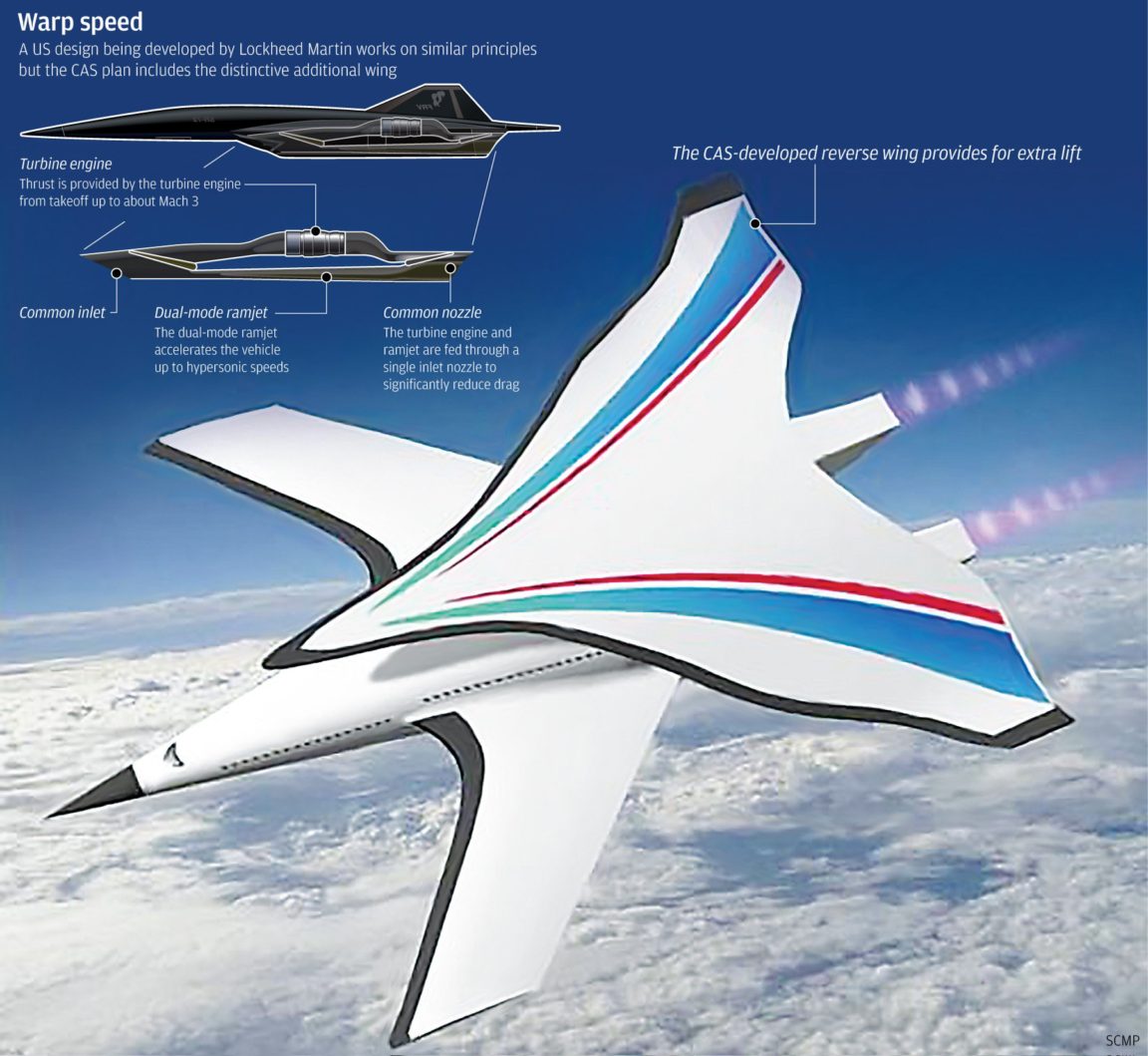 À titre de comparaison, un vol commercial entre Pékin et New York peut durer au moins 14 heures. Des chercheurs de l’Académie chinoise des sciences de Pékin ont récemment testé avec succès leur « I Plane » dans une soufflerie, à des vitesses allant de Mach 5 à Mach 7, soit plus de 6 000 km/h. l’I-plane comporte ici deux ailes courtes dirigées vers l’avant et une troisième aile en forme de triangle qui surplombe l’avion. Les petites ailes permettent de diminuer la friction de l’air et les turbulences, mais aussi d’améliorer la poussée de l’engin.