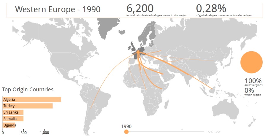 La carte nous apprend par exemple qu’en 1990, seulement 6200 personnes ont obtenu l’asile en Europe occidentale, une zone qui ne prend pas en compte l’Europe du Sud et l’Europe du Nord. Au même endroit en l’an 2000, ce sont 122 400 personnes qui ont pu y trouver refuge. Entre 2010 et 2013, ce nombre est repassé sous la barre des 50 000.