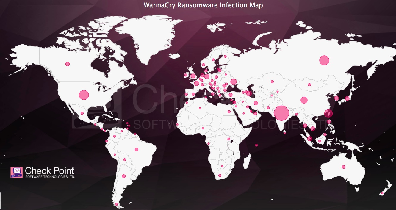 Check Point Software, un fournisseur mondial de solutions de sécurité informatique basé en Israël, a publié il y a quelques jours une carte recensant 34 300 tentatives d’attaque dans 97 pays. Alors que le rythme était d’une tentative par seconde à l’apparition du logiciel, cette cadence est passée à une tentative toutes les trois secondes aujourd’hui. Les principaux pays ayant été affectées sont l’Inde, les États-Unis ainsi que la Russie.