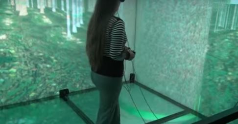 Du fait de la faible distance de projection, le système assurant cette tâche est naturellement en très haute définition. L’utilisateur porte alors des lunettes spéciales et se trouve au centre de la pièce pour être intégralement immergé dans cet environnement virtuel. Le son produit par des haut-parleurs habituellement installés dans les angles est également en 3D.
