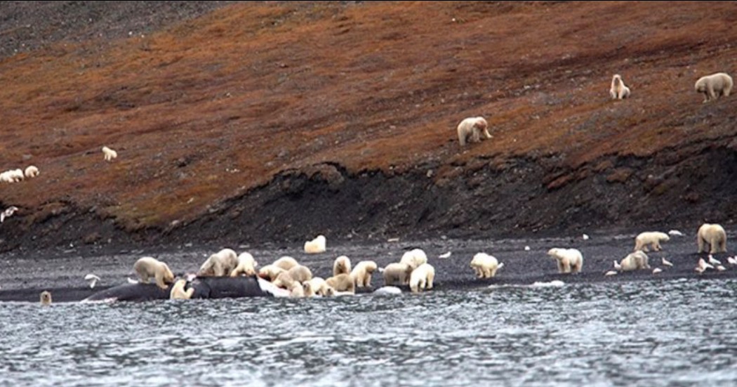 « Des gens se pinçaient pour s’assurer que tout ça se passait réellement », témoigne Rodney Russ. La baleine boréale peut atteindre jusqu’à 18 mètres de long et peser plus de 90 tonnes. Il s’agit donc de beaucoup de nourriture pour des ours polaires visiblement affamés et attirés par l’odeur de la carcasse (les ours polaires peuvent respirer une odeur à plus de trente kilomètres de distance).