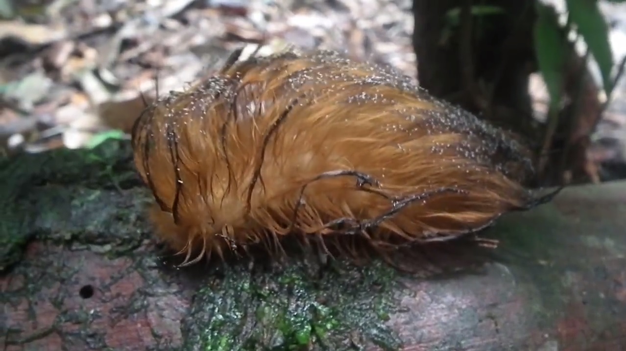 En l’occurrence, pour pallier à la vulnérabilité occasionnée par l’importante période de nidification (20 jours) et l’absence fréquente de ses parents, le petit de la Laniocera hypopyrrha tente de se faire passer pour une chenille toxique appartenant à la famille des megalopygidae.