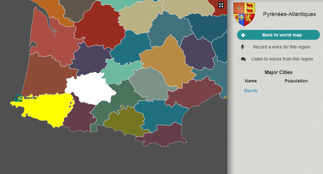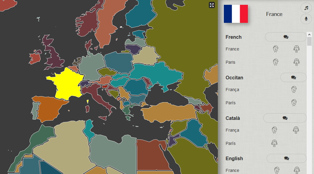 Prenons le cas de la France (voir captures ci-après). La bande sur la droite contient les voix de français et d’étrangers prononçant les mots « France » et « Paris » dans leur propre langue. Lorsque la carte des départements s’affiche, il est possible de cliquer sur une d’entre-elles et une fiche dédiée apparaît, donnant la possibilité d’entendre les dialectes.
