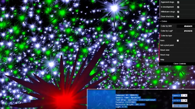 Ainsi, l’outil permet de faire le tri entre les différentes substances, que celles-ci soit autorisées (ou interdites) sur le marché, ou encore en cours de développement. Les formes moléculaires sont visibles, matérialisées par différentes couleurs, et lorsque l’on clique sur un des points lumineux, de nombreuses informations s’affichent : nom, formule, propriétés chimiques entre autres.