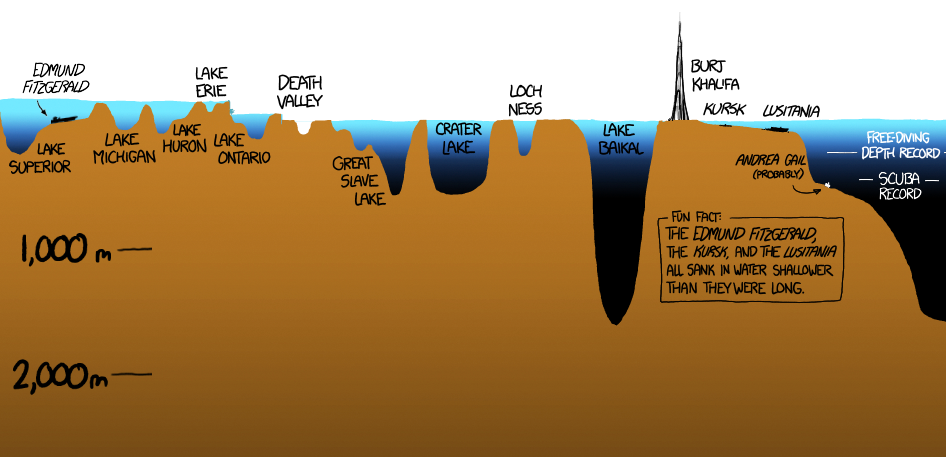 Pour mettre en perspective la profondeur des lacs et océans, le site Xkcd.com a créé l’illustration ci-dessous (cliquez sur l’image pour l’agrandir). Comme vous pouvez le voir, la majeure partie de l’océan ne voit même pas la lumière du soleil. On commence par le SS Edmund Fitzgerald, un navire américain autrefois en activité dans les Grands Lacs d’Amérique du Nord. Celui-ci repose aujourd’hui à 160 m de profondeur dans le lac Supérieur. Le Loch Ness, un lac d’eau douce situé dans les Highlands (Écosse), s’étend de son côté jusqu’à 227 mètres de profondeur. Petit joueur comparé au Crater Lake (États-Unis) et ses 593 mètres de profondeur, ou encore au Lac Baïkal (Sibérie), et ses 1642 mètres de profondeur.