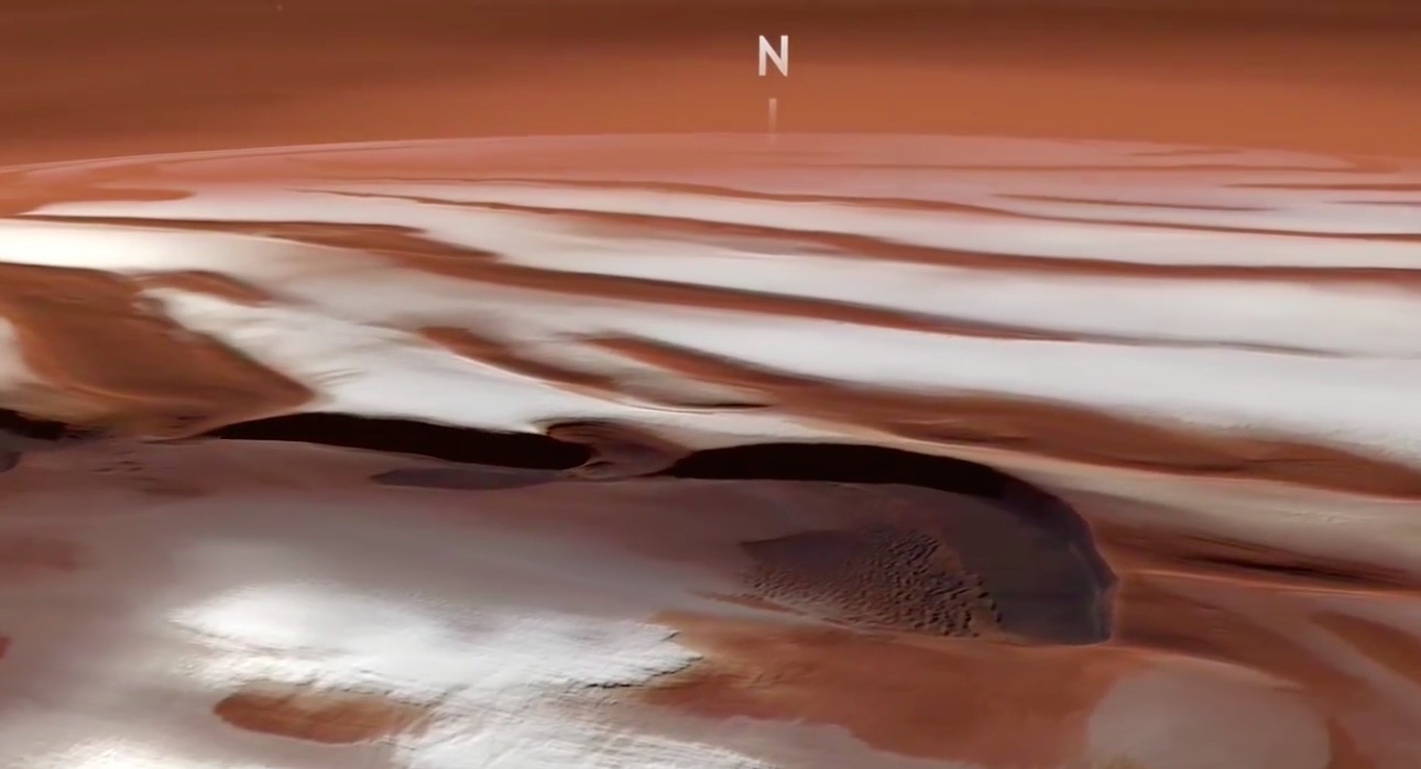 Grâce aux images rapportées par une caméra installée sur la sonde spatiale Mars Express, un groupe scientifique de l’Université libre de Berlin a réalisé une animation simulant un survol du Pôle Nord de la planète rouge.