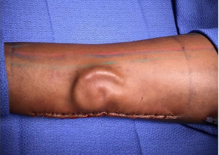 Bien qu’il s’agisse ici d’une première pour un chirurgien de l’armée, l’idée de « cultiver » des oreilles n’est pas nouvelle. Dans les années 1990, une photo alarmante – mais réelle – d’une souris avec ce qui semblait être une oreille humaine attachée à son dos fut largement diffusée. Les chercheurs tentaient déjà à l’époque de cultiver des oreilles humaines faites de cartilage. Cette « oreille » était en fait une structure de cartilage, cultivée en ensemençant des cellules de cartilage de vache dans un moule en forme d’oreille biodégradable par la suite implanté sous la peau de la souris.