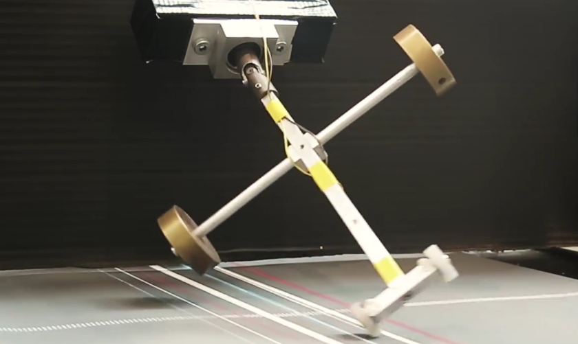 La vidéo tournée par l’équipe (à visionner en fin d’article) puis diffusée sur la toile montre une simple croix en aluminium comportant des roulettes ainsi que deux poids accrochés sur chacun de ses côtés. Il s’agit d’une sorte d’avatar de valise reproduisant le roulis hollandais, le fameux mouvement de tangage.