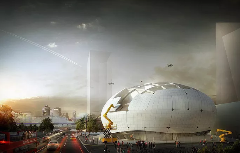 Les architectes ont imaginé que la façade métallique incurvée – en forme de tête de champignon – allait être construite par des machines. Par ailleurs, il ne sera pas question d’un simple assemblage de pièces, car les meneurs du projet ont pensé à mobiliser les machines pour le moulage, la soudure et le polissage de ces mêmes éléments. C’est pour cette raison que les machines qui devraient être mobilisées sont de nature variée : robots, drones et autres machines d’impression 3D. Également, l’ameublement du musée sera en partie assuré par les machines.