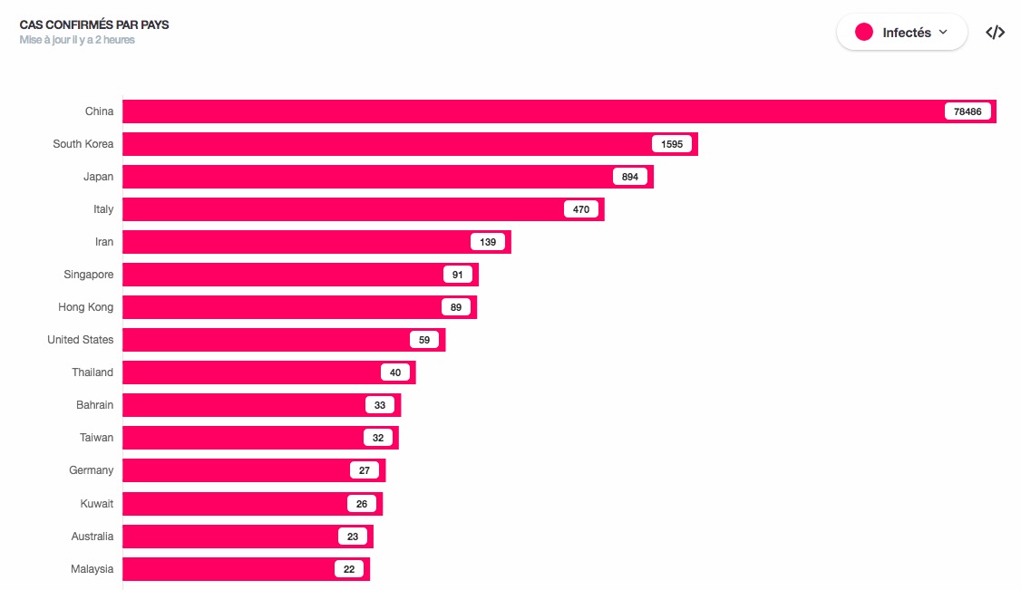 Si le Covid-19 tue beaucoup moins en Chine ces derniers temps, la découverte de trois nouveaux foyers d’infection – Italie, Iran et Corée du Sud – est loin d’être rassurante. Si la situation en Italie et en Iran est très préoccupante, celle de la Corée du Sud a tendance à s’emballer. En effet, le dernier bilan fait état de 1 766 cas pour 13 décès (plus de 500 nouveaux cas en 24h). Ainsi en moins d’une semaine, la Corée du Sud jusque-là relativement épargnée est devenue le deuxième pays le plus touché après la Chine concernant le nombre de cas.