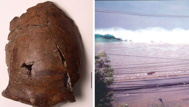 Ce crâne, vieux de 6 000 ans, c’est le géologue australien Paul Hossfeld qui mit la main dessus en 1929, près de la ville côtière d’Aitape en Papouasie-Nouvelle-Guinée. L’homme n’avait en revanche à l’époque pas pris le temps d’échantillonner les sédiments dans lesquels était enterré le crâne. Près de 90 ans plus tard, de nouvelles recherches menées par Mark Golitko, de l’Université de Notre-Dame, aux États-Unis, suggèrent que ce fragment osseux appartient à la plus ancienne victime d’un tsunami au monde. Les analyses sédimentaires confirment en effet que la zone fut balayée par un violent tsunami à la même époque.