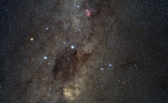 La Croix du Sud contient également l’amas ouvert NGC 4755, connu également sous le nom de « boîte à bijoux », qui renferme une centaine d’étoiles regroupées sur environ 20 années-lumière, à près de 7 500 années-lumière de la Terre. Pour la repérer, c’est très simple, mais encore faut-il franchir l’équateur et aller dans l’hémisphère sud. Le ciel austral est en effet bien plus riche en étoiles que le ciel du Nord. Entourée sur trois côtés par le Centaure et au sud par la Mouche, vous n’aurez ensuite aucun mal à repérer la Croix. Cette image réalisée par l’astrophotographe Yuri Beletsky pour l’ESO pourrait vous mettre sur la voie :