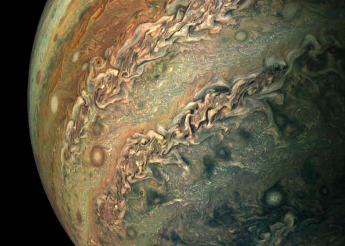 La sonde Juno, lancée en 2011, est entrée en orbite autour de Jupiter en juillet 2016 dans le but d’étudier le champ magnétique mystérieux du géant gazier, mais également la gravité et la magnétosphère polaire. Tous les 53 jours, la sonde fait un survol de la planète pour recueillir des données et prendre des images en utilisant sa JunoCam. Les images de son huitième survol ont été diffusées par la NASA le 5 septembre 2017. Certaines, encore brutes, ont pu être colorisées par des passionnés.