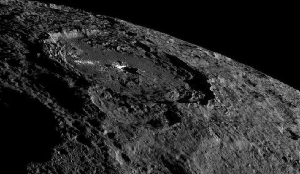 C’est au centre de ce cratère de 92 km de largeur et de 4 km de profondeur que l’on trouve ces fameux points extrêmement lumineux. Pour les astronomes, ce matériau serait en fait composé de sels laissés par un liquide saumâtre qui s’écoule du dessous, se fige, puis se sublime, c’est-à-dire qu’il est directement transformé de glace en vapeur. Cette remontée vers la surface du liquide salé serait due à un impact d’astéroïde.