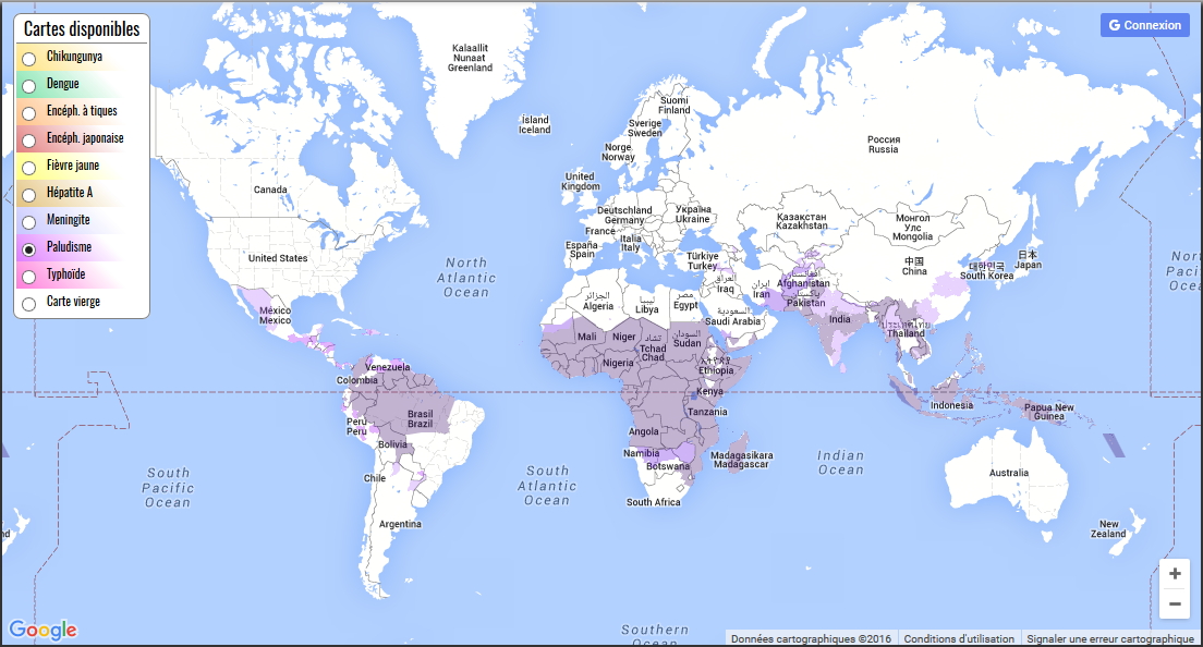 La carte interactive baptisée « Métis », dont la base n’est autre que Google Maps, permet d’effectuer des recherches suivant certaines maladies, et ainsi observer leur étendue. Parmi ces maladies, on retrouve la Dengue, le Chikungunya, le Paludisme, la Fièvre jaune ou encore l’Encéphalite japonaise. Voici par exemple les résultats de recherche concernant le Paludisme :