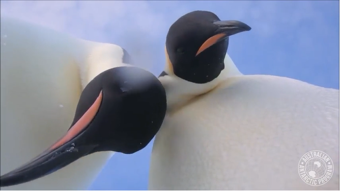 Alors qu’il visitait la station de recherche Mawson située à proximité, l’explorateur Eddie Gault avait placé la caméra sur le sol près de l’Auster Rookery, où se trouvait une grande colonie de manchots empereurs. Ces oiseaux sont naturellement curieux : on observe alors l’un d’entre eux se dandiner vers la caméra pour la relever d’un seul coup de patte. L’un de ses congénères débarque ensuite. Pendant environ une demi-minute, les deux gazouillent et penchent leurs têtes vers l’écran, avant de se redresser et de secouer la tête et le ventre à plusieurs reprises.