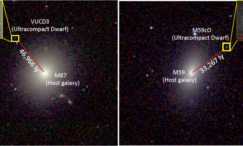 Ces deux galaxies naines ultra-compactes baptisées VUCD3 et M59cO orbitent autour de galaxies plus massives dans l’amas de galaxies de la Vierge, situé à environ 80 millions d’années-lumière, qui compte environ 2 000 galaxies (90 % d’entre elles sont des galaxies naines). Les chercheurs estiment que le premier trou noir (VUCD3) a une masse équivalente à environ 4,4 millions de soleils, ce qui représente environ 13 % de la masse totale de sa galaxie. Le second trou noir (M59cO) a quant à lui une masse d’environ 5,8 millions de soleils, soit environ 18 % de la masse totale de sa galaxie. Par comparaison, le trou noir monstrueux au centre de la Voie lactée a une masse de 4 millions de soleils, mais représente moins de 0,01 % de la masse totale de la galaxie.