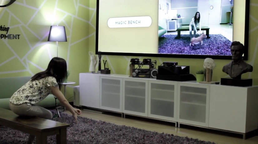Le banc magique (Magic bench) développé par Disney offre alors une expérience bluffante. Plusieurs personnes peuvent s’asseoir sur le fameux banc et ainsi interagir avec des éléments virtuels apparaissant sur un écran placé en face à quelques mètres. Divers capteurs et caméras combinés à un système audio et un système haptique dissimulé donnent alors l’impression d’une immersion intégrale.