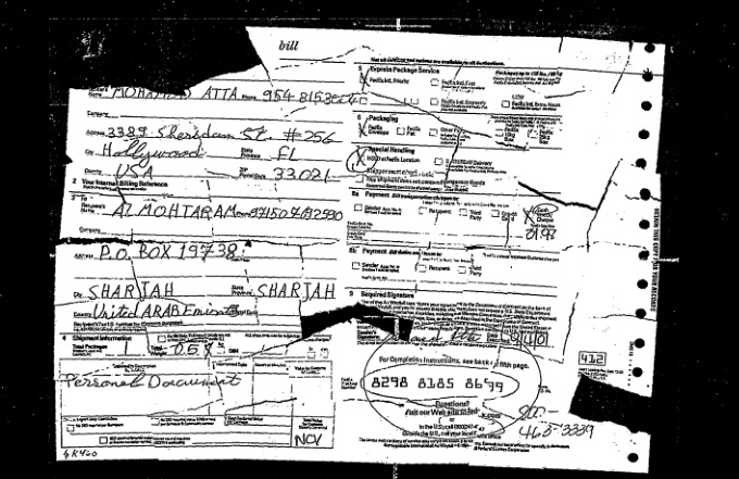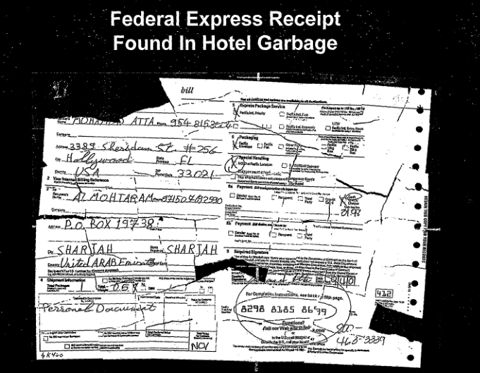 Les informations contenues dans le document sont relatives aux 19 terroristes ayant perpétré les attentats, dont un portrait a été dressé. Pèle mêle, le diaporama fait état d’enquêtes préliminaires, d’images de vidéosurveillance d’aéroports ainsi que d’autres preuves telles qu’un ticket de caisse qui aurait appartenu à Nawaf al-Hazmi, un terroriste impliqué dans le détournement du Vol AA77, le troisième avion qui s’est écrasé sur le Pentagone (voir ci-dessous).