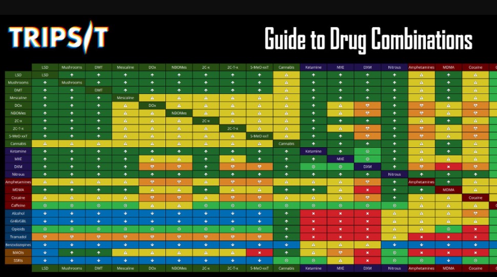 Élaboré et publié par le site TripSit, ce tableau rassemble une multitude de drogues connues comme la cocaïne, la kétamine, le LSD, l’opium, les amphétamines ou encore les champignons hallucinogènes. Le tableau rassemble également des drogues plus douces comme le cannabis ainsi que d’autres substances habituellement non assimilées aux drogues, mais pouvant s’avérer addictives, telles que l’alcool et la caféine par exemple.