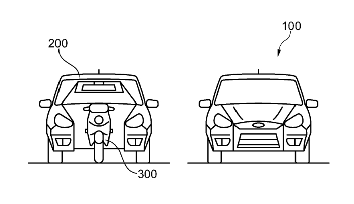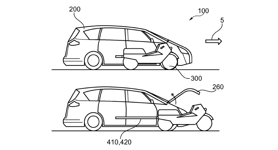 Déposé auprès de l’United States Patent and Trademark Office (USPTO), le document détaille précisément le fameux concept. Le brevet décrit donc une voiture renfermant une moto. Cette dernière – équipée d’un moteur électrique – peut bien sûr se déplacer par elle même. Cependant, pour être stockée dans l’automobile, la moto devra être insérée entre le siège conducteur et le siège passager, c’est-à-dire par l’avant du véhicule. De cette façon, la voiture transporte la moto, mais recharge également son moteur électrique !