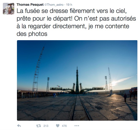 Thomas Pesquet, qui s’apprête à devenir le dixième français à aller en orbite, a posté une photo sur Twitter avec comme légende « L-3 [L pour lancement] : Transfert de la fusée jusqu’au pas de tir. Ça sent le décollage ! »