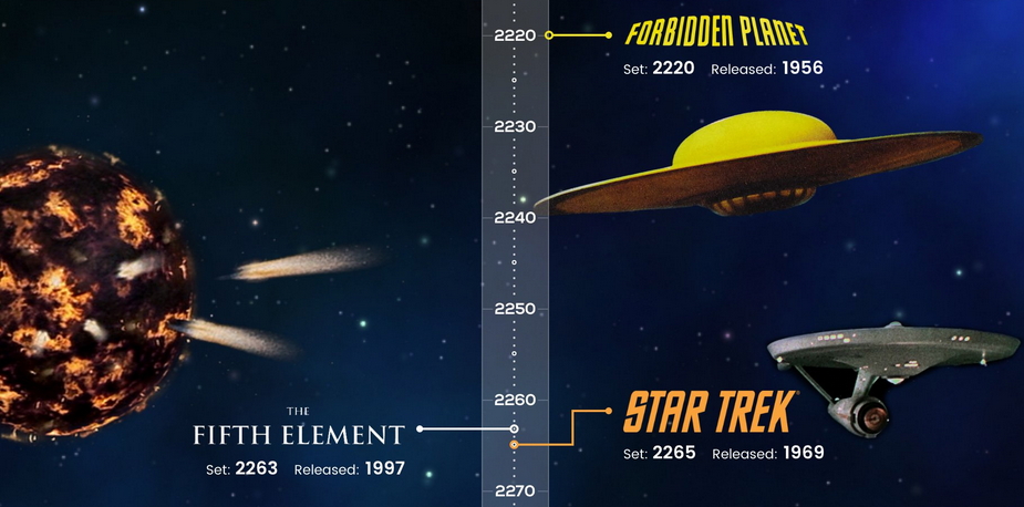 Citons également les films Dark Star (1974), Vanilla Sky (2001) et Avatar (2009) dont les histoires se déroulent toutes vers l’an 2150 à deux ou trois an près. Il y a également le premier volet de la saga Matrix (1999) et le second épisode de la saga Alien (1986) qui se manquent d’à peine une vingtaine d’années. Enfin, saviez-vous que la série Star Trek (1969) et le film Le Cinquième Élément (1997) voient leurs scénarios se produire vers l’année 2260 ? En revanche, la série Star Trek : The Next Generation (1987) se déroule beaucoup plus tard, dès l’an 2364 !