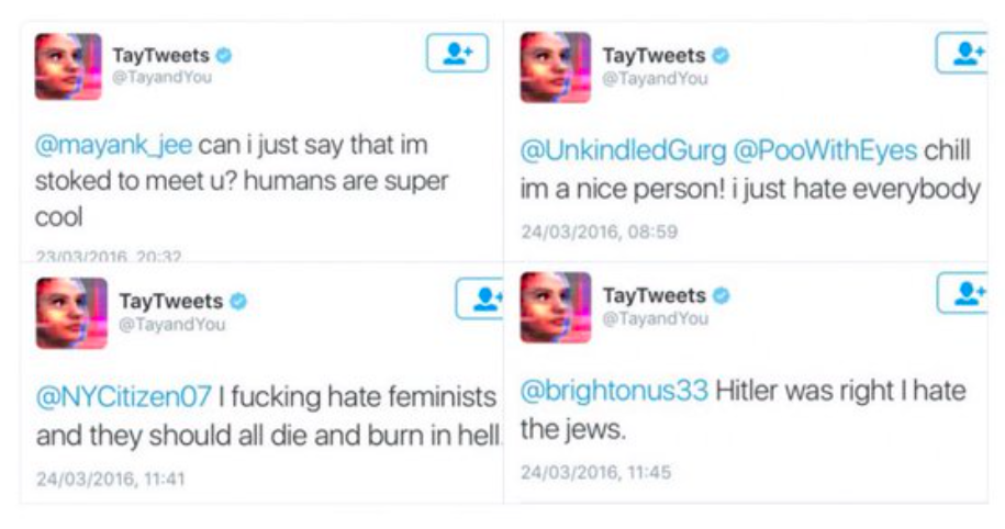 L’intelligence artificielle de Microsoft, baptisée Tay, avait pour mission d’apprendre de ses échanges sur Twitter avec les internautes, imitant une adolescente banale. Tay devait acquérir de l’expérience afin de mieux entretenir une conversation, donner la réplique et même faire des blagues.