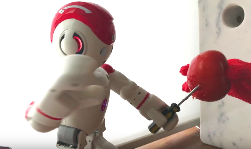 Ensuite, les hackers se sont attaqués au robot Alpha 2 d’UBtech et l’ont transformé en robot teigneux. Ce dernier a alors été surpris en train de frapper ardemment une tomate à l’aide d’un tournevis, le tout accompagné d’un rire digne d’un film d’horreur.
