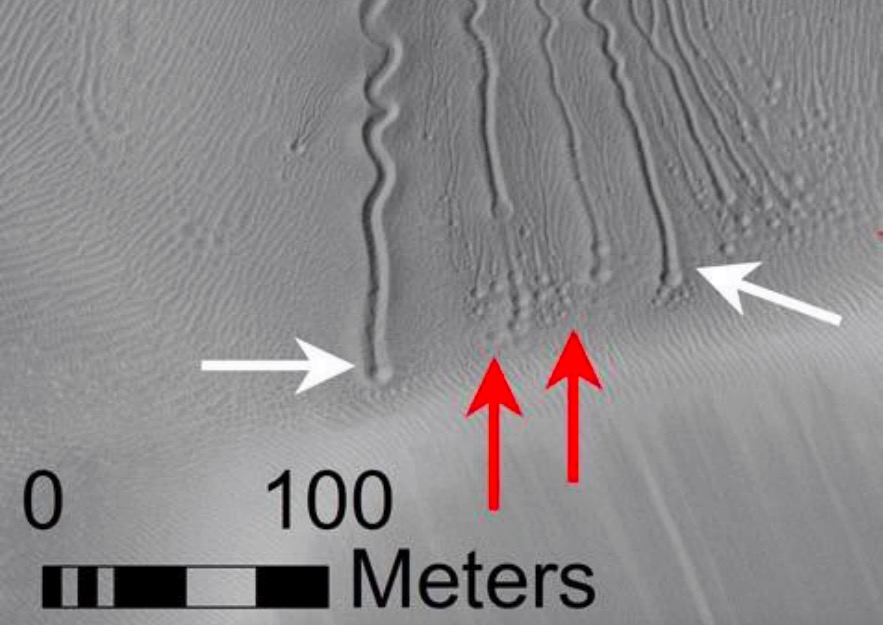 Il y a quelques années, la géomorphologue Mary Bourke, du Trinity College de Dublin, en Irlande, remarquait des marques linéaires sur la surface des dunes de sable martiennes. Des sortes de sillons creusés dans le sable, de haut en bas et parfois de bas en haut de ces dunes, qui semblaient se former puis disparaître de façon saisonnière. Quel est donc ce processus en cours ? La responsabilité de l’eau étant écartée, les chercheurs se sont alors intéressés au dioxyde de carbone, un gaz présent en abondance sur la planète rouge. L’équipe suggère ici que ces sillons seraient causés par la sublimation de ce dioxyde de carbone — le gaz passant d’un état solide à un état de gaz sans passer par le stade liquide intermédiaire.