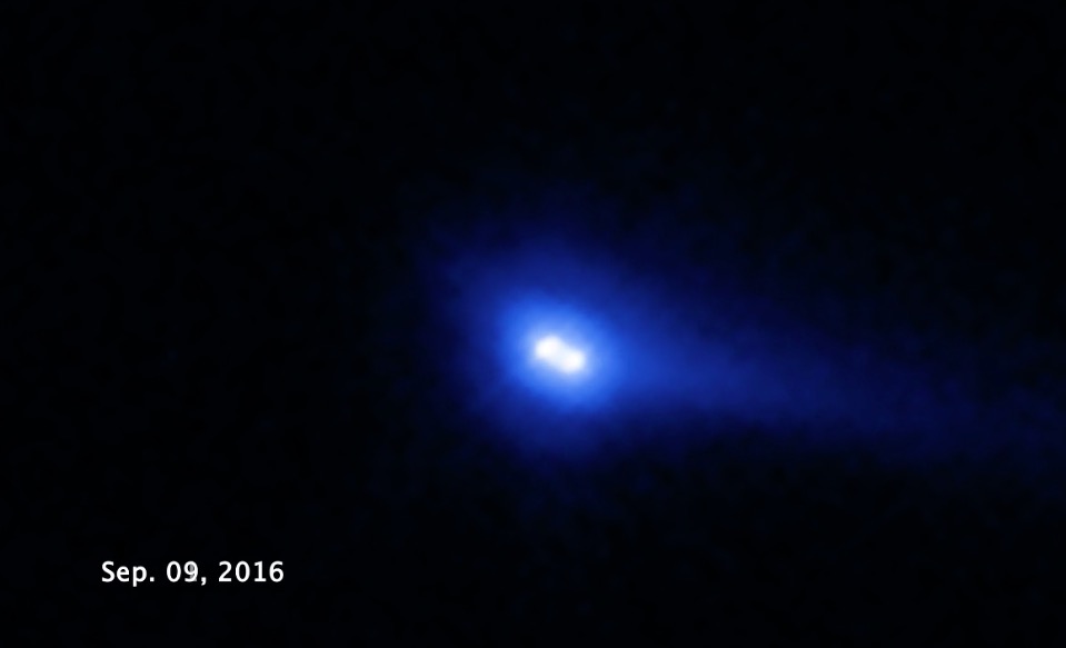 En septembre 2016, l’astéroïde 288P se rapprochait de notre étoile. Ce fut l’occasion pour les astronomes d’examiner l’objet en détail. Pour ce faire, ils ont fait appel à Hubble. Mais alors que les chercheurs s’attendaient à n’observer qu’un seul et unique objet, les images du télescope ont révélé deux astéroïdes distants d’environ cent kilomètres orbitant l’un autour de l’autre. En s’approchant du Soleil et sous l’effet de la chaleur, les astronomes ont également observé la glace en train de se sublimer, les deux objets arborant une jolie de queue de comète.