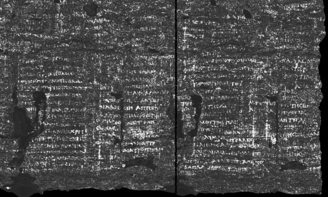 Le mercredi 5 février, le Vesuvius Challenge a toutefois annoncé une nouvelle « avancée historique » en dévoilant la première image réussie de l’intérieur du parchemin où apparaissent des colonnes de texte en grec. Brent Seales, informaticien à l’université du Kentucky et cofondateur du Vesuvius Challenge, a déclaré que les organisateurs étaient « ravis du succès de l’imagerie de ce rouleau ». Il a ajouté qu’il « contient plus de texte récupérable que ce que nous avons jamais vu dans un rouleau d’Herculanum scanné ».