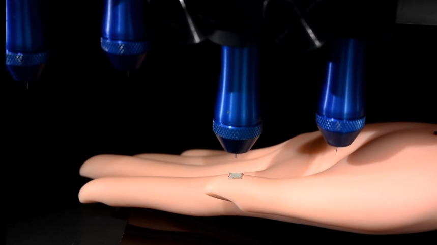 La peau en question est extensible jusqu’à trois fois la surface imprimée au départ et est incarnée par de petits patches tenant sur le bout des doigts. Dans la vidéo présente en fin d’article, il est possible de voir que ces patches intègrent des matériaux électroniques coulés dans le silicone.