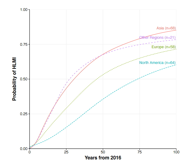 L’infographie visible en fin d’article se base sur l’étude en question intitulée « When Will AI Exceed Human Performance ? » (Quand l’IA surpassera-t-elle les performances humaines ?), mais également sur des questions posées à environ 350 participants de deux grandes conférences sur l’IA, comme l’explique le Courrier international. Le moins que l’on puisse dire, c’est que les prédictions avancées par les chercheurs sont très variées. Par exemple les experts asiatiques estiment que l’automatisation complète de notre société se fera d’ici 104 ans alors que les chercheurs américains sont un peu plus réservés (169 ans).