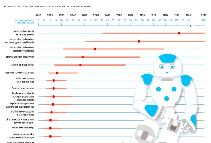 Selon l’infographie, si dans une dizaine d’années l’intelligence artificielle est capable de gagner au jeu Angry Birds, de remporter des tournois de poker ou encore de plier du linge, d’autres prédictions voient beaucoup plus loin. En effet, avec 50 % de probabilités, les machines auront rattrapé les humains vers 2050 pour l’écriture de best-sellers, vers 2060 en ce qui concerne les recherches en mathématiques ou encore vers 2100 pour ce qui est de mener des recherches en intelligence artificielle.