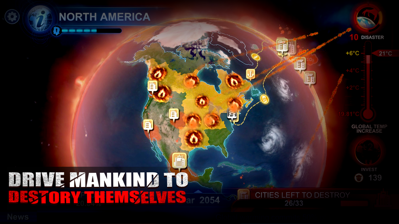 Lorsque vous générez du CO², vous glanez des points permettant le déblocage de catastrophes telles que des incendies, des sécheresses, des tornades etc. dont la fréquence augmente au fur et à mesure que la planète se fragilise. De plus, il faut faire attention à ne pas faire grimper le « taux de conscience du public », car si tel est le cas, il y aura de plus en plus de recherches effectuées sur le CO² et de conférences traitant du climat. Au final, si l’humanité trouve la solution, vous avez tout simplement perdu la partie.