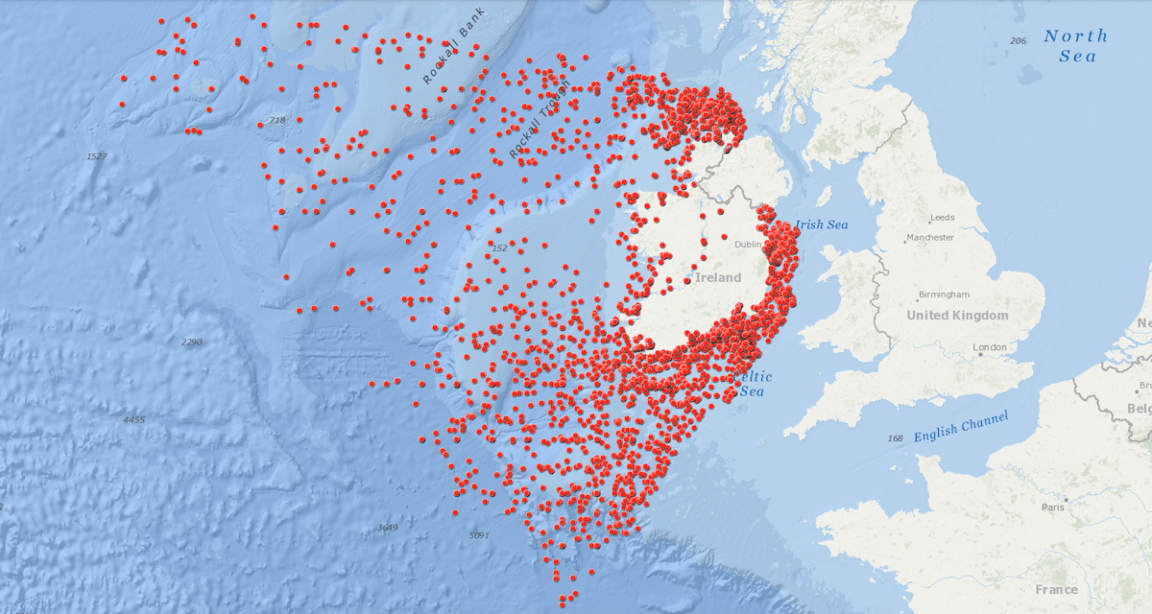 Le « Wreck Viewer », publié par le National Monuments Service du gouvernement irlandais en avril, nous montre les emplacements approximatifs de 3 554 épaves dans une zone de 570 000 km carrés autour de l’Irlande et de l’océan Atlantique Nord.