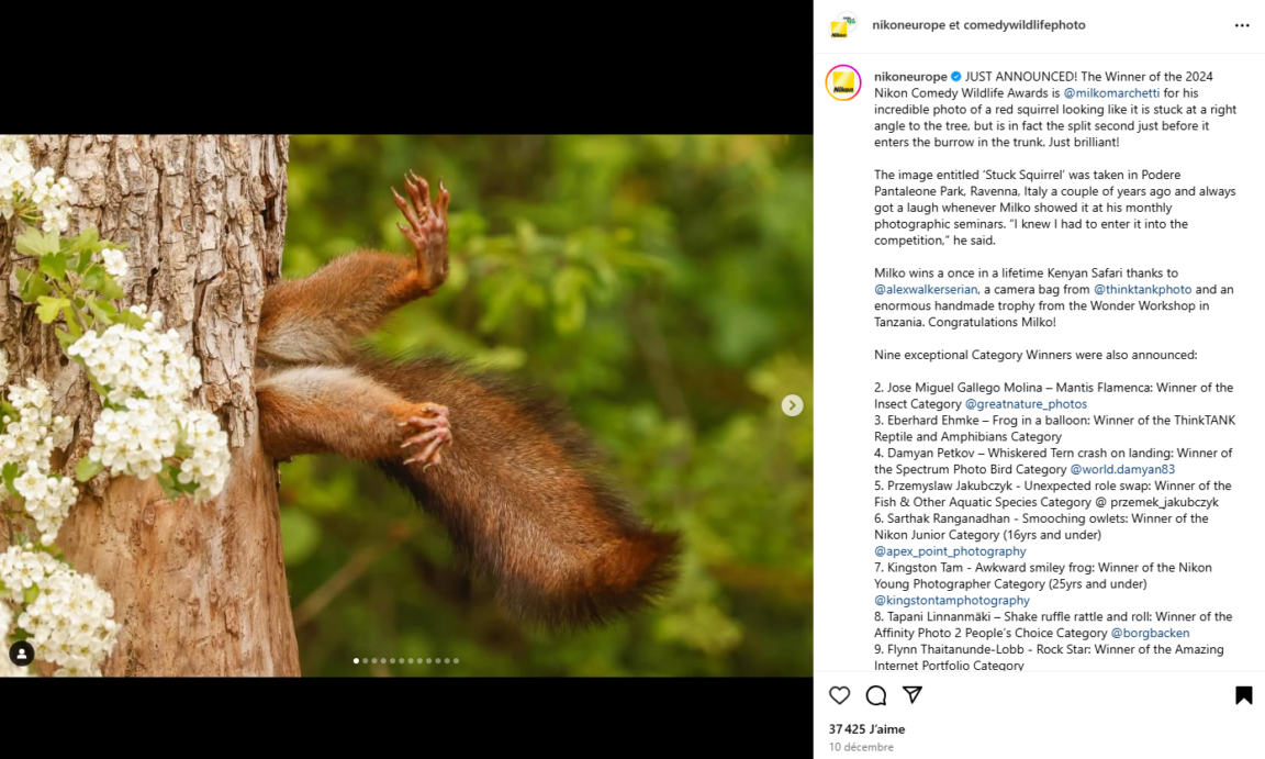 Chaque année, les Nikon Comedy Wildlife Photography Awards mettent en lumière les clichés animaliers les plus amusants. Pour l’édition 2024, c’est une image capturée par Milko Marchetti qui a conquis le jury. Intitulée « Stuck Squirrel », cette photo montre un écureuil dans une posture improbable, les pattes en l’air, essayant d’entrer dans sa cachette nichée dans un tronc d’arbre, rapporte CNN.