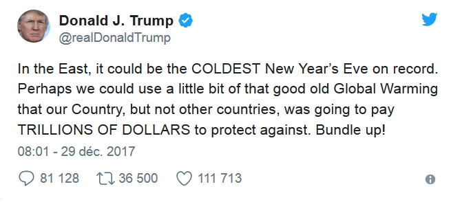 « Dans l’est, cela pourrait être la veille du jour de l’an LA PLUS FROIDE jamais enregistrée. Peut-être qu’on pourrait utiliser un peu de ce bon vieux réchauffement climatique que notre pays, contrairement aux autres, s’apprêtait à payer DES TRILLIONS DE DOLLARS pour s’en protéger. Couvrez-vous ! »