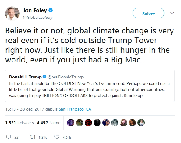 « Le changement climatique est véritablement réel même s’il fait froid à l’extérieur de la Trump Tower en ce moment. De la même façon, il y a toujours de la faim dans le monde, même si vous venez de manger un Big Mac. »