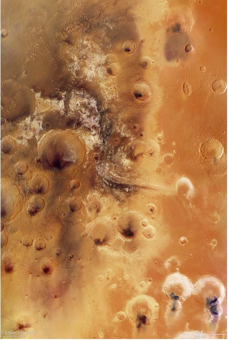 En nous permettant de nous mettre dans la peau d’un oiseau survolant la zone, la sonde et sa High Resolution Stereo Camera (HRSC) nous font également découvrir une roche-couverture très foncée parmi les paysages aux teintes d’ocres qu’on y observe. Ces restes de cendres volcaniques qui pourraient avoir protégé des traces de microbes très anciens de l’érosion et des radiations intéressent quant à eux particulièrement les géologues ainsi que les exobiologistes.