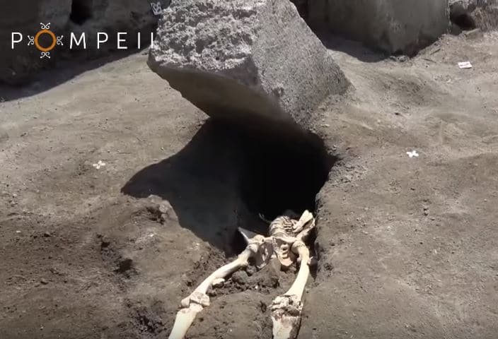 Les images publiées par le ministère italien du Patrimoine culturel nous montrent la moitié inférieure d’un squelette s’étendant sous une grosse pierre de près de trois cents kilos. Selon les autorités, la victime était un homme âgé d’un peu plus de trente ans qui tentait probablement de fuir la violente explosion volcanique. À environ huit kilomètres de là, l’éruption du Vésuve avait en effet déclenché un barrage d’ondes de choc sismiques et d’ondes pyroclastiques à travers Herculanum et Pompéi. Les secousses ressenties au sol auraient pu déclencher la chute d’une pierre de maçonnerie, mais les autorités de Pompéi soulignent également la possibilité qu’une pierre puisse avoir été « violemment projetée par le nuage volcanique ».