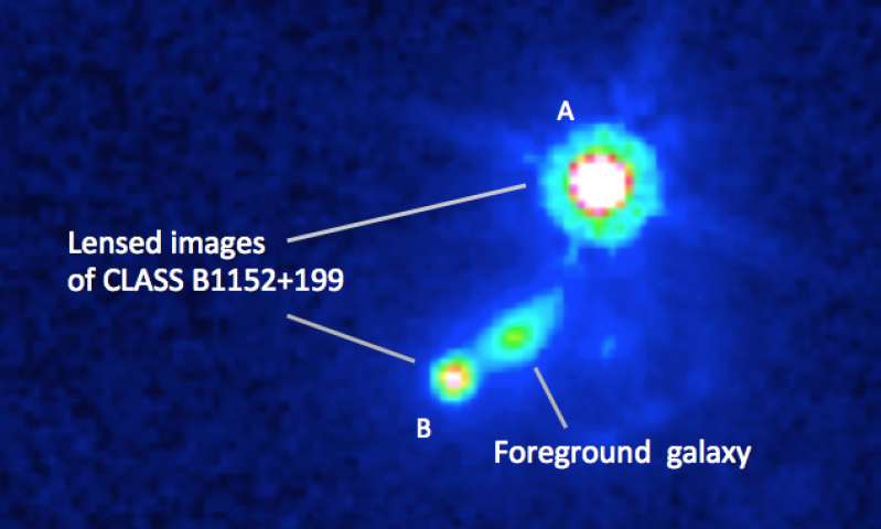 Ils ont fait appel à un quasar situé en arrière-plan, à plus de huit milliards d’années-lumière. Les quasars sont les objets célestes les plus brillants de l’Univers. Les astronomes ont donc pu repérer des oscillations dans la lumière diffuse traversant la galaxie située entre ce quasar et notre planète. L’image du quasar s’est en fait polarisée, celui-ci apparaissant deux fois en deux images très différentes comme vous pouvez le voir ci-dessous :